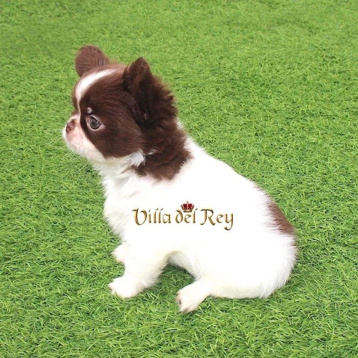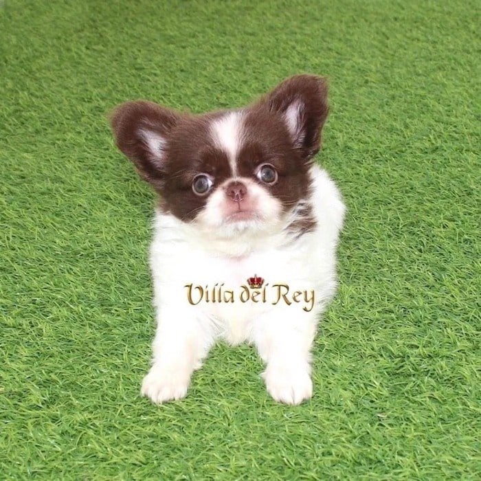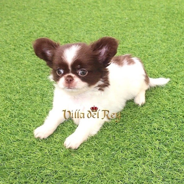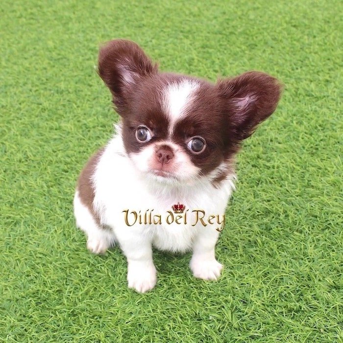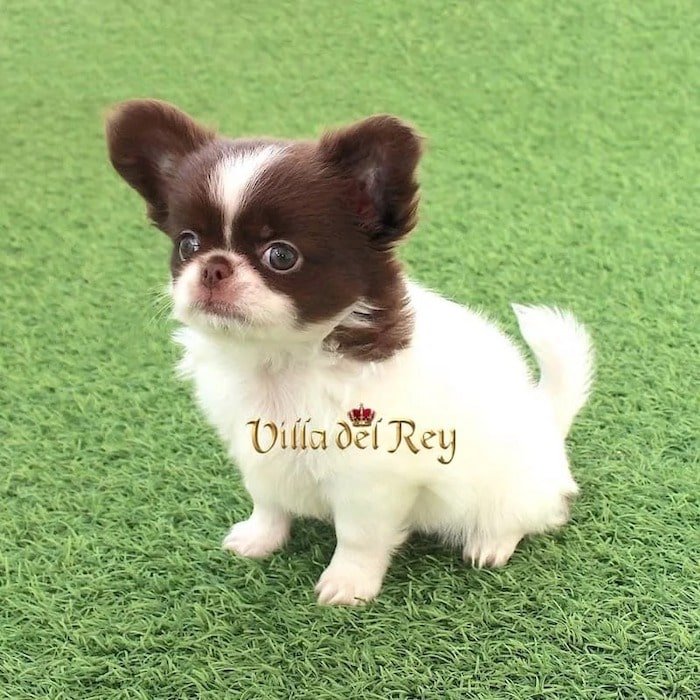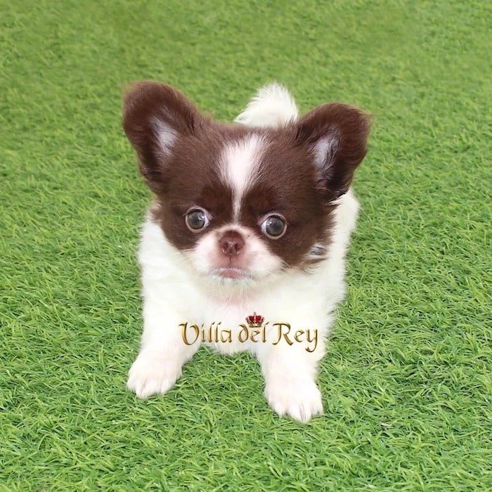 This little girl is an exceptional long-coat Chihuahua with striking white and chocolate markings, and a practically perfect mask. She has a compact body and strong, sturdy legs; it’s an absolute joy to watch her move and play.